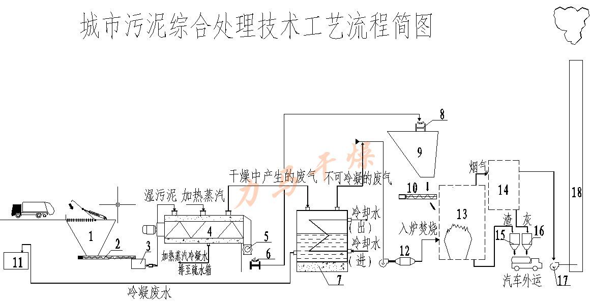 1.污泥仓 2.污泥取料机 3.污泥给料机 4.污泥烘干机 5污泥出料机 6.皮带输送机 7.冷凝器 8.皮带输送机(干污泥)9.污泥仓 10.炉前给料机 11.凝结废水箱 12.锅炉送风机 13.污泥焚烧炉 14.烟气处理系统 15.渣仓 16.灰仓 17.引风机 18.烟囱