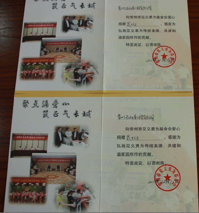 自11月份力马企业向常州市见义勇为基金会爱心捐赠20’000元后,常州市精神文明建设专题会议上,市委领导对民营企业关爱见义勇为人员、弘扬见义勇为精神的举动作了高度评价。12月份,常州力马干燥工程有限公司再次向常州市见义勇为基金会捐赠20’000元。