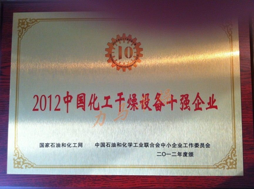 凭借2012优异的销售业绩,卓越的企业管理水平,精湛的生产制造能力,周到的售后服务水准,常州力马干燥工程有限公司获评“2012中国化工干燥设备十强企业”。