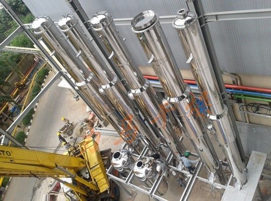 5:浓缩 浓缩一般分为真空浓缩、离心浓缩和冷冻(浓缩,这里采用真空浓缩。它通过真空降低水的沸点,真空度达-0.08Mpa以上,此时水的沸点只有60度左右,从而使液体加快浓缩,浓缩液的浓度一般不超过60%(折光度计)。由于从蒸发塔出来的浓缩液温度高于常温,因此必须经过冷却再送入贮罐,从而减少流失。