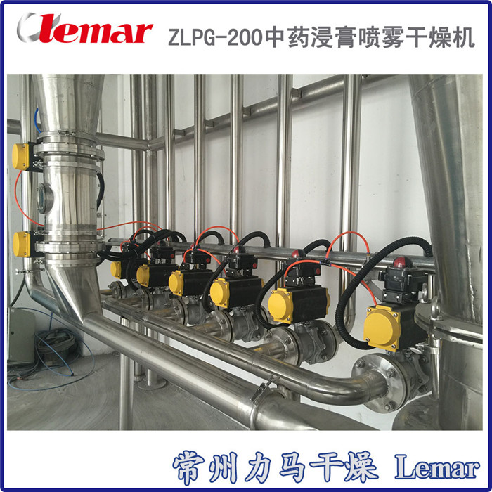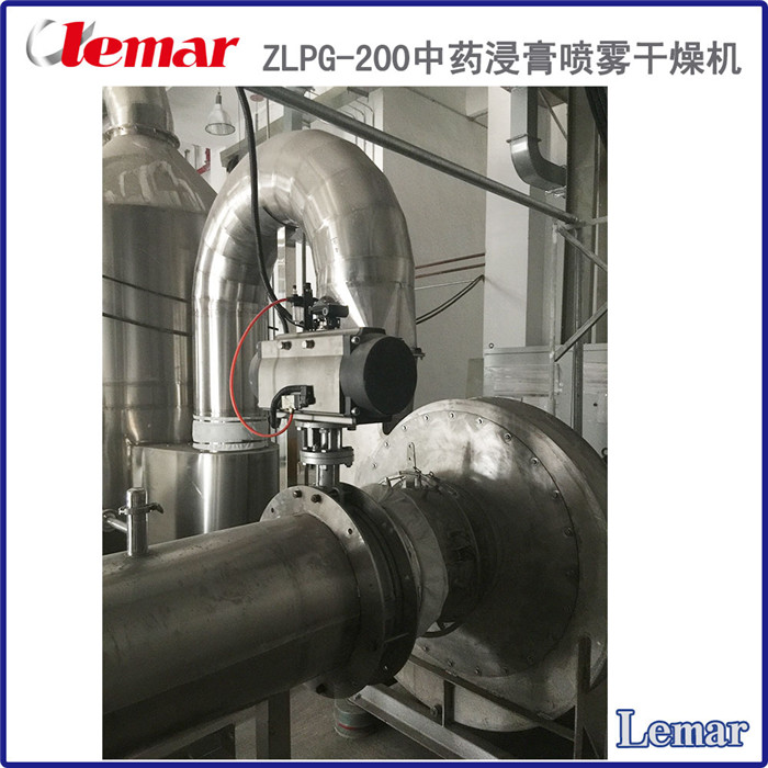 ZLPG-200中药浸膏喷雾干燥塔,该塔内外壁及管道均采用了SUS304食品级不锈钢材质,选用了LPG-300型高速离心雾化器, 雾化盘直径为0.15m,转速为15500r/min。