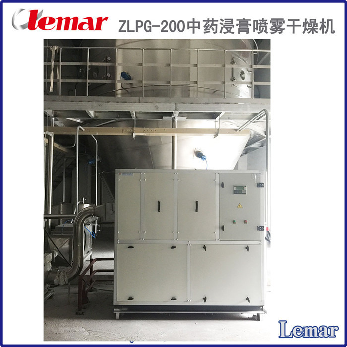 济川药业集团此次订购的ZLPG-200中药浸膏喷雾干燥,塔径为5米,塔高为12米,蒸汽耗量为500Kg/h,干燥进风温度t1=180℃,干燥排风温度t2=90℃。分别用于干燥三拗片浸膏和小儿豉翘浸膏物料,该物料的PH值在4—6范围内,初始水分: 80 ~85%(视物料的流动性可提高),物料^终水分:≤5% (粉体吸湿性强);水分蒸发量:   200Kg/h;料液温度:常温~85℃;料液比重: ≤1.1g/cm3