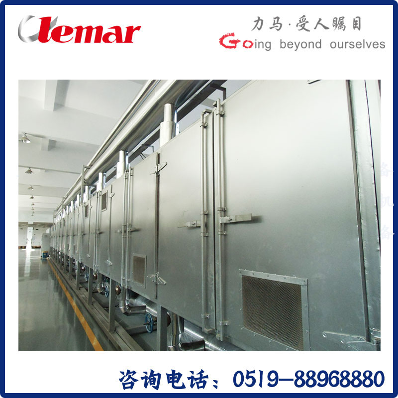 带式干燥机是成批生产用的连续式干燥设备,用于透气性较好的片状、条状、颗粒状物料的干燥,对于脱水蔬菜、催化剂、中药饮片等类含水率高、而物料温度不允许高的物料尤为合适;该系列干燥机具有干燥速度快、蒸发强度高、产品质量好的优点, 对脱水滤饼类的膏状物料, 需经造粒或制成条状后方可干燥。